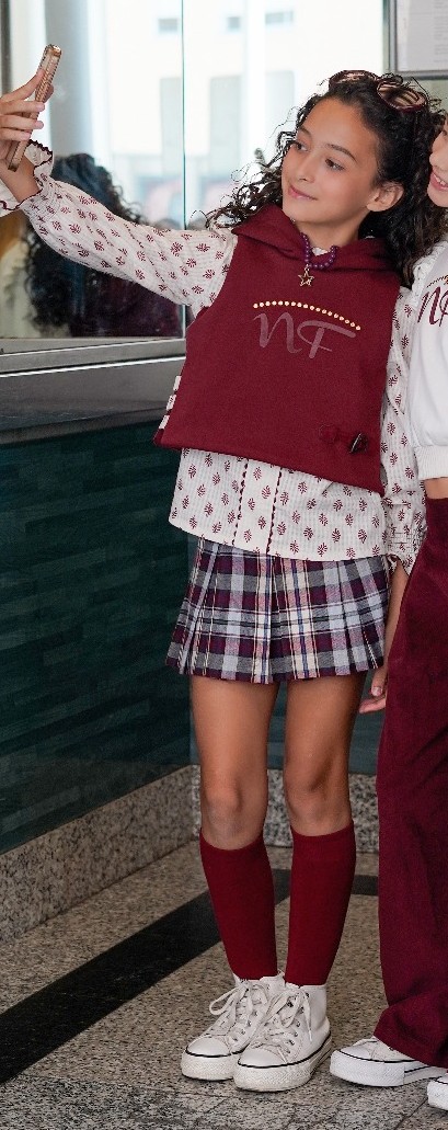 BOMBACHO CON BLUSA niña SELENE de NOMA FERNANDEZ, camisa fondo blanco con dibujos granates, bombacho con culote por dentro cuadros grandes grises, granates y azules, chaleco felpa granate, invierno 2025