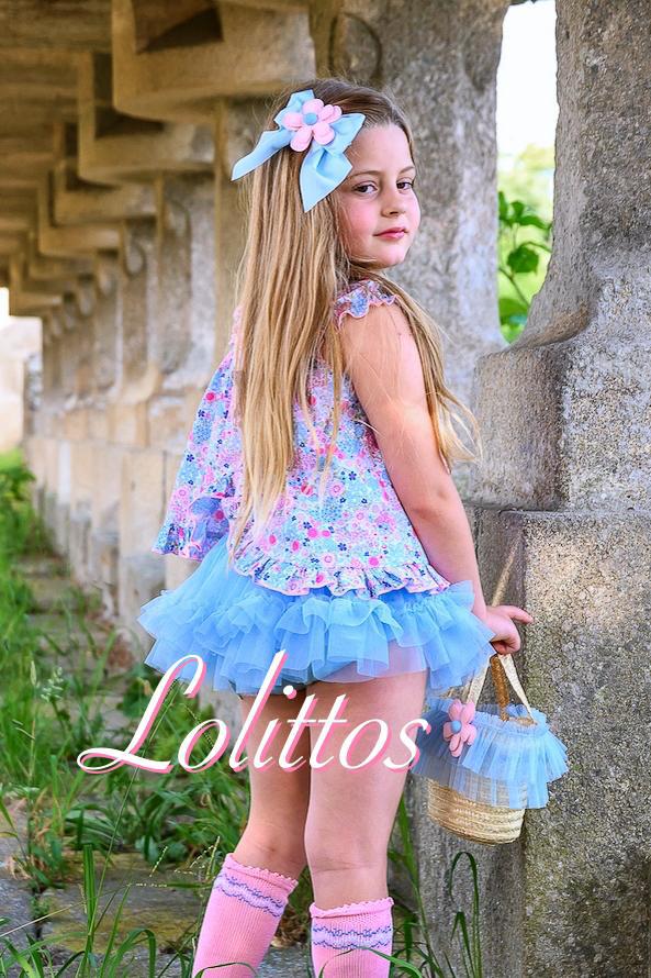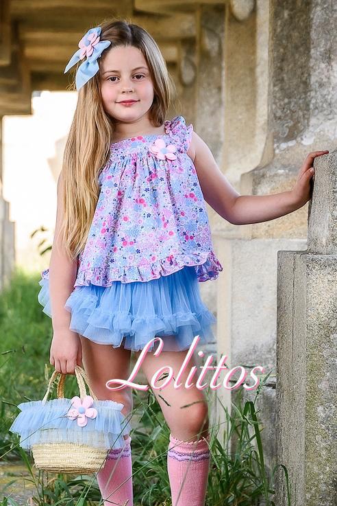 BOMBACHO CON CAMISA FAUNA de LOLITTOS, falda tull 2 volantes azul claro, camisa estampada de flores color pastel, verano 2026.