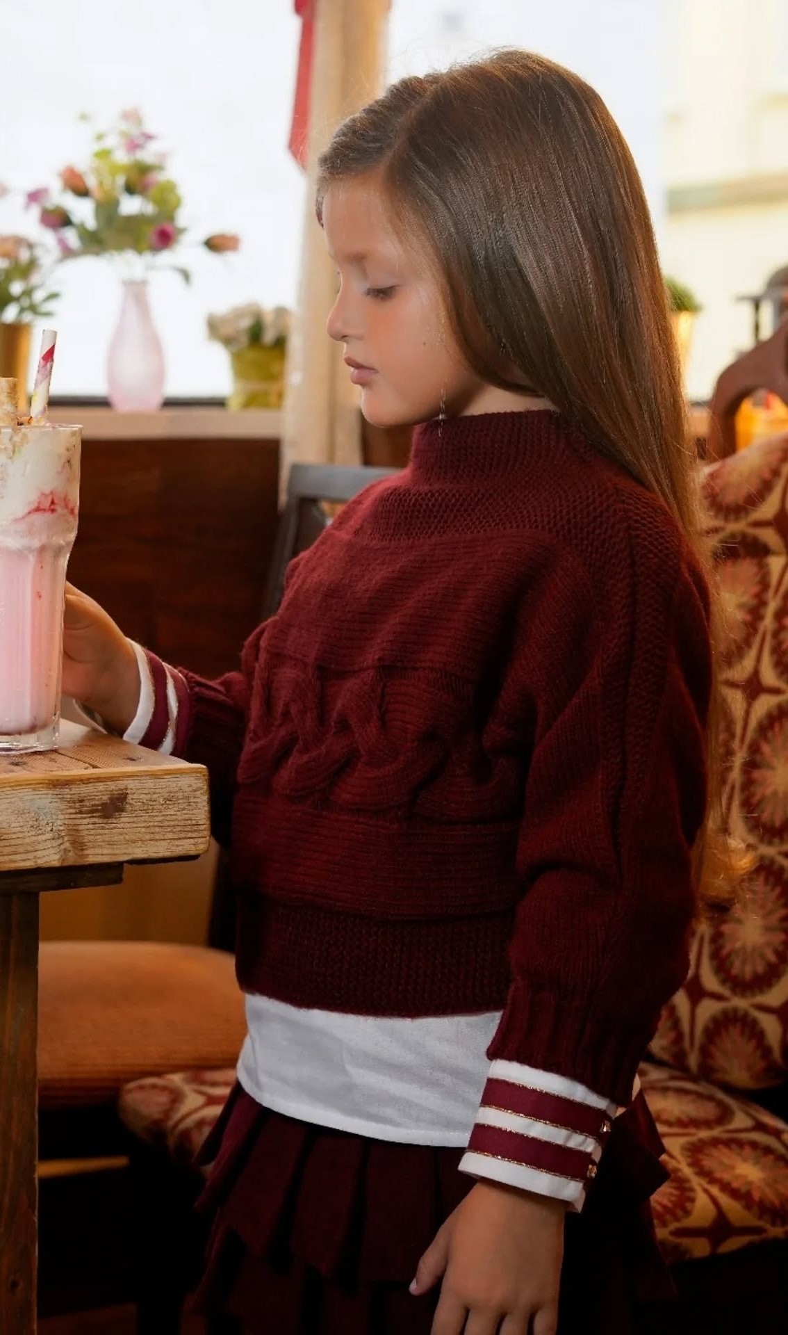 BOMBACHO CON CAMISA Y JERSEY CRIS de NOMA FERNANDEZ, camisa blanca con franjas granates en puños, bombacho tablas micropana granate, jersey de punto granate con dibujo en punto sentido horizontal, invierno 2025.