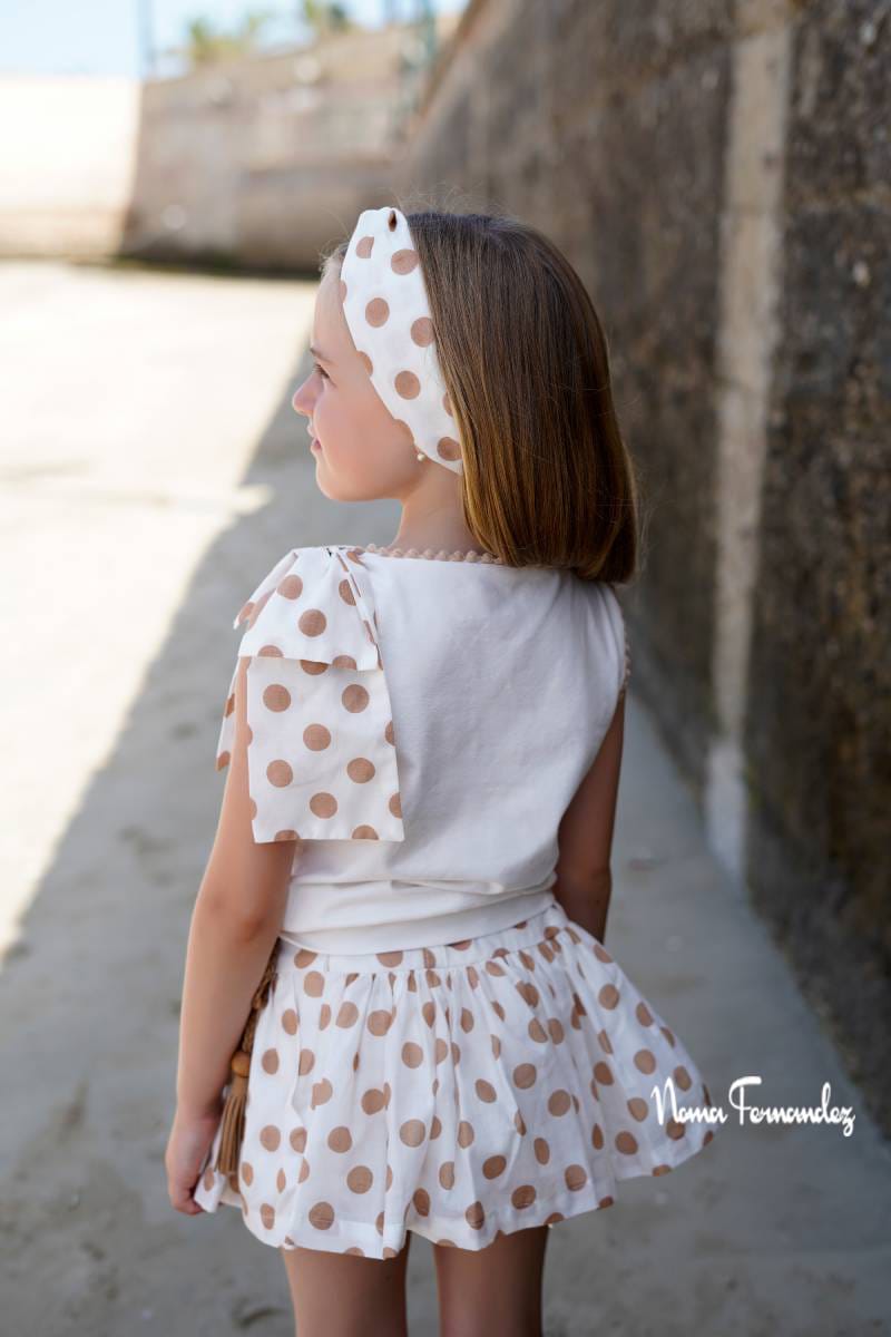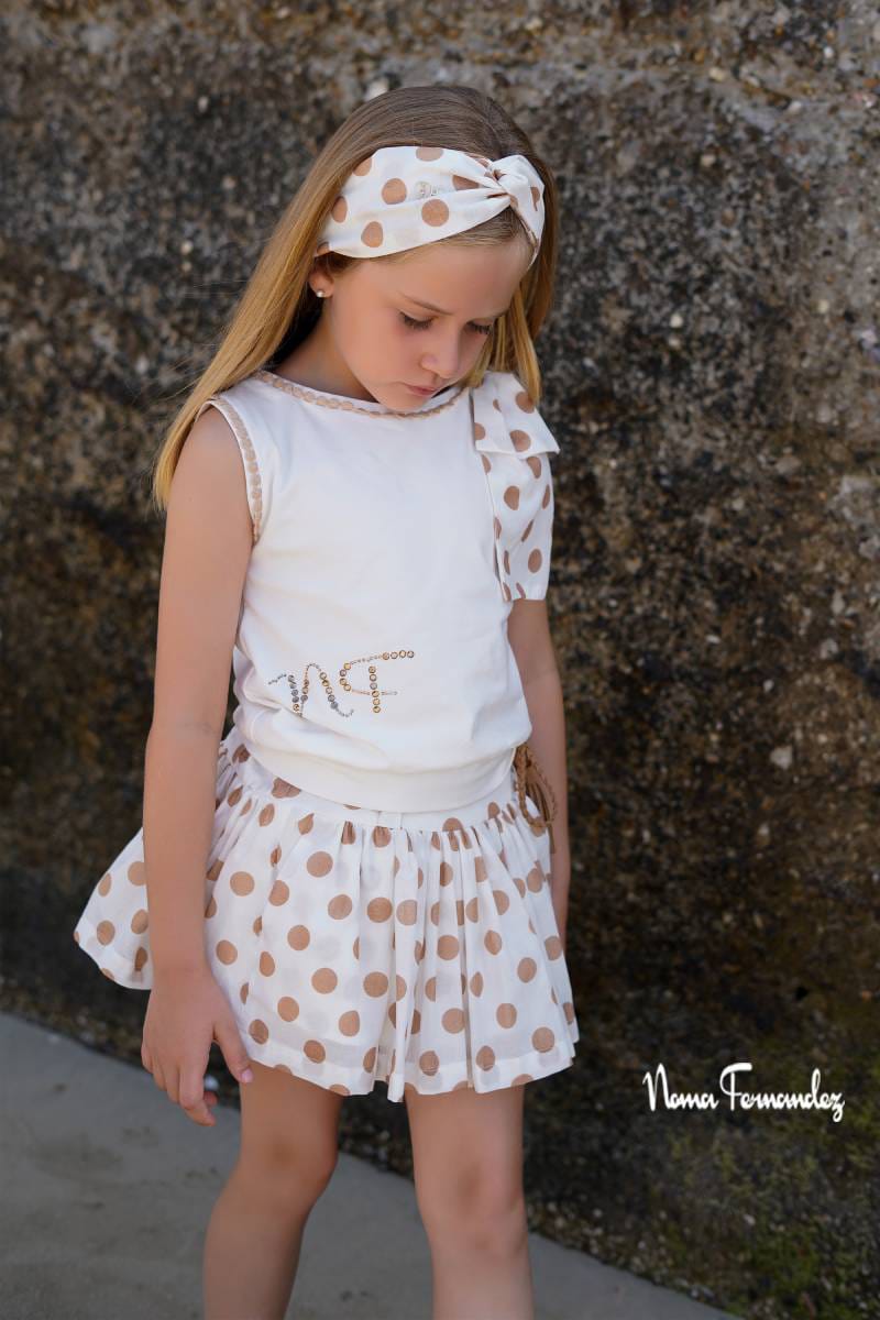 FALDA CON CAMISETA HAYA de NOMA FERNANDEZ, falda fondo beige con topitos grandes marrones, camiseta algodon con letras doradas «NF» y lazo grande en hombro izquierdo mismo tejido que la falda, verano 2026.