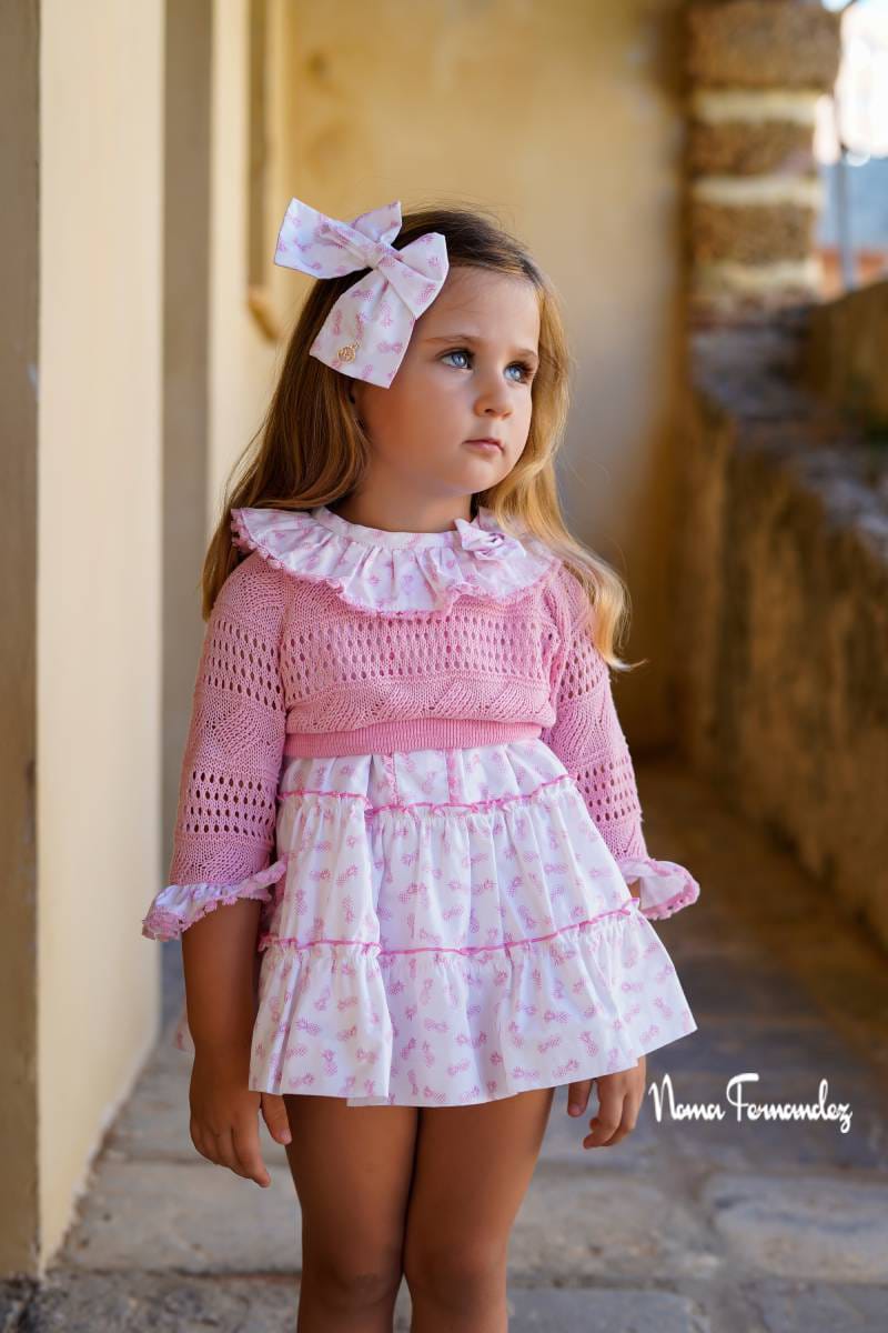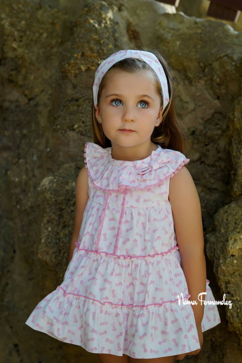 JESUSITO CON JERSEY SAUCE de NOMA FERNANDEZ, vuelo, fondo blanco con dibujos de piñas en color rosa, jersey corto calado con volante en puños mismo tejido que vestido, verano 2026.