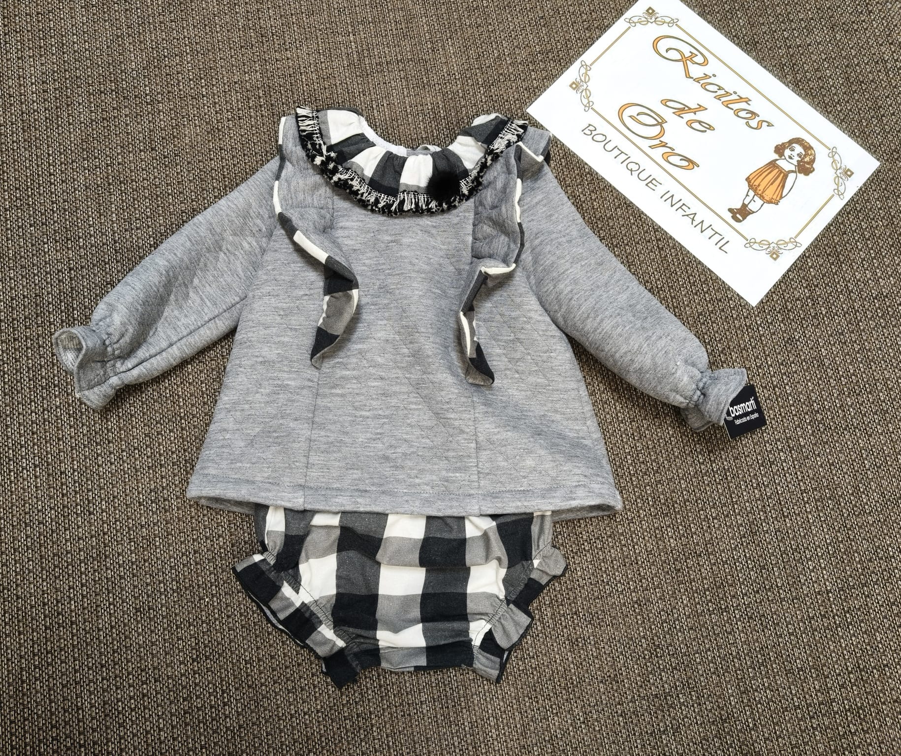 JESUSITO FELPA GRIS de BASMARTI, felpa guateada en color gris, volante vertical con interior cuadros negros y grises, braguita y cuello mismos cuadros, REF 25800, invierno 2025.