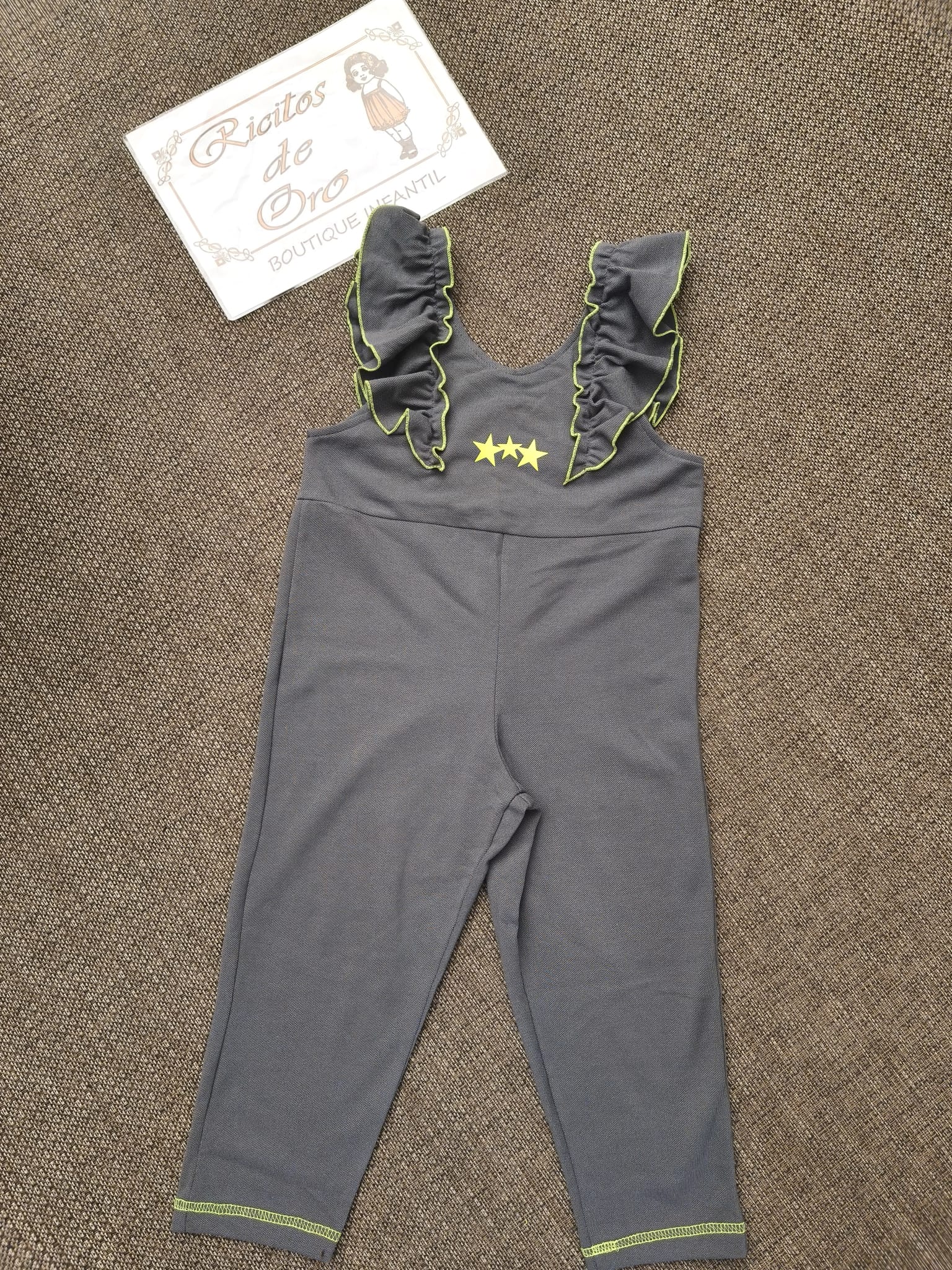 MONO GRIS AURORA BOREAL de LA MARTINICA, tejido pique color gris oscuro con tirantes de volantes remallado flúor amarillo, verano 2026.