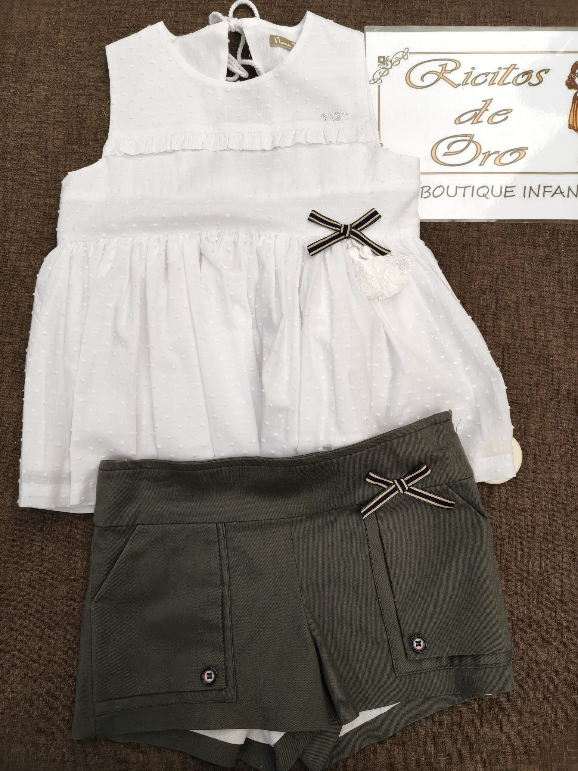 SHORT CON BLUSON OLIVO de NOMA FERNANDEZ, short color verde caza y camisa vuelo plumeti blanco, verano 2026.