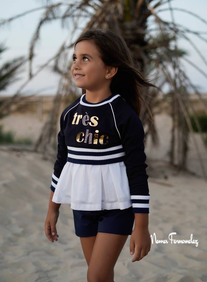SHORT CON BLUSON Y SUDADERA CORTA OLMO de NOMA FERNANDEZ, short azul marino con camisa vuelo blanca y sudadera marino corta con letras doradas «tres chic», verano 2026.