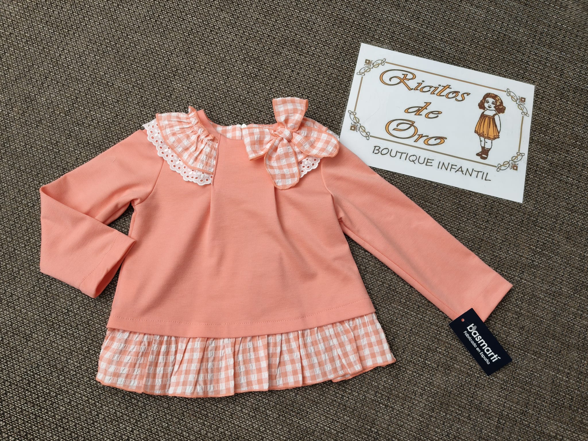 SUDADERA SAMBA de BASMARTI, felpa naranja con volantes en hombros y parte baja vichy naranja con puntilla blanca, verano 2026.