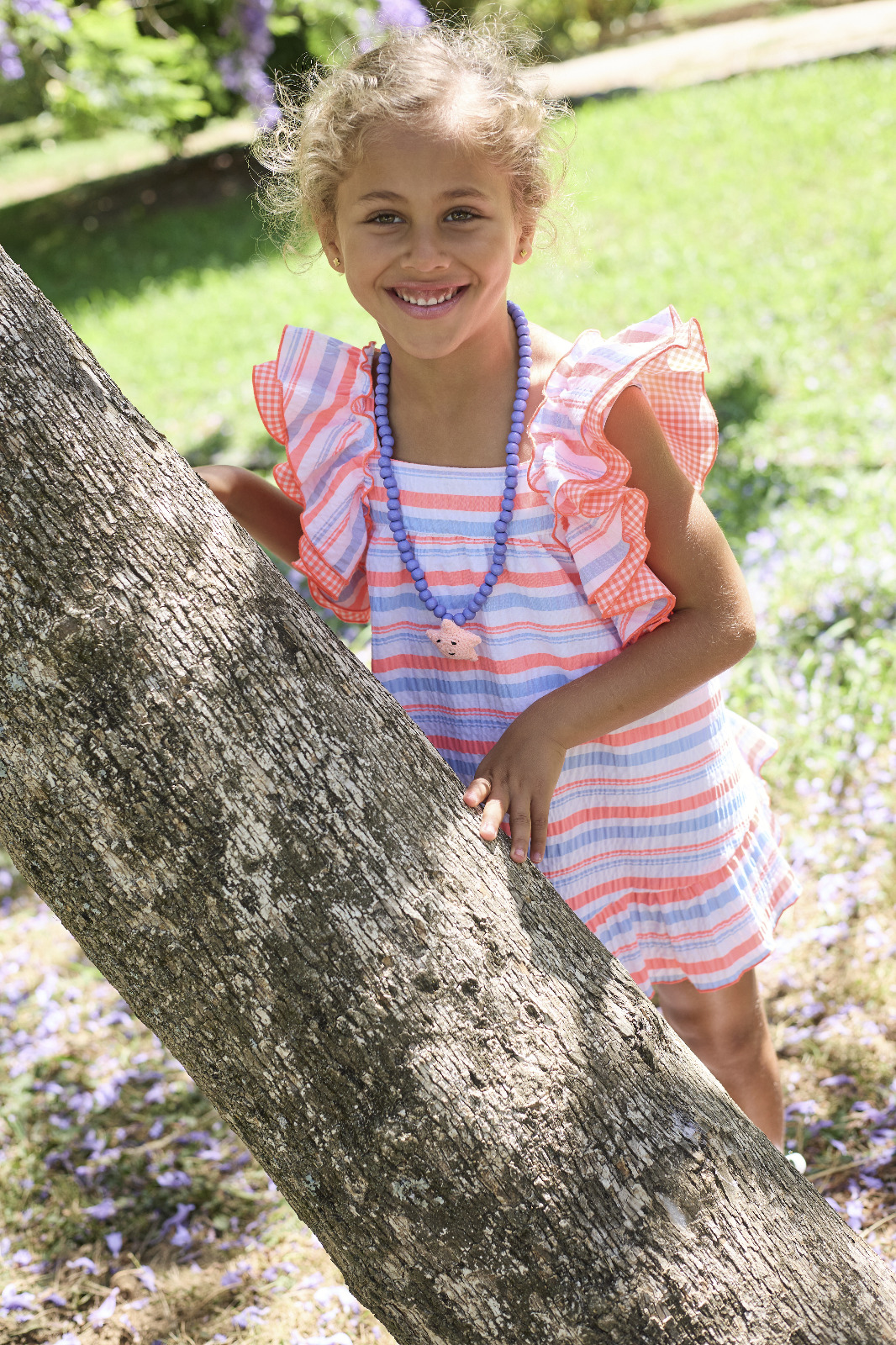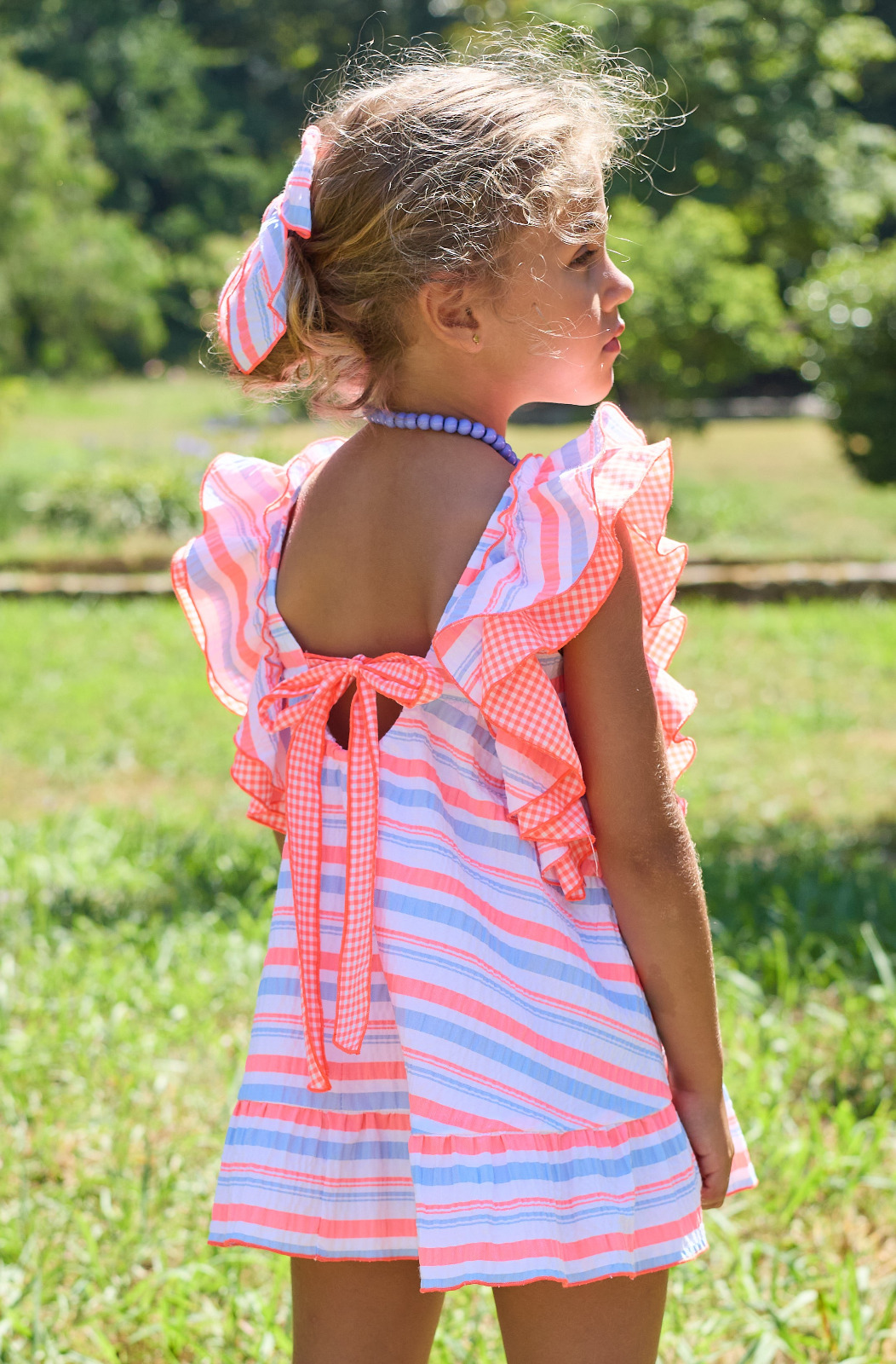 VESTIDO BIKE de LA MARTINICA, rayas horizontales naranja fluor con azul y blanco, verano 2026.