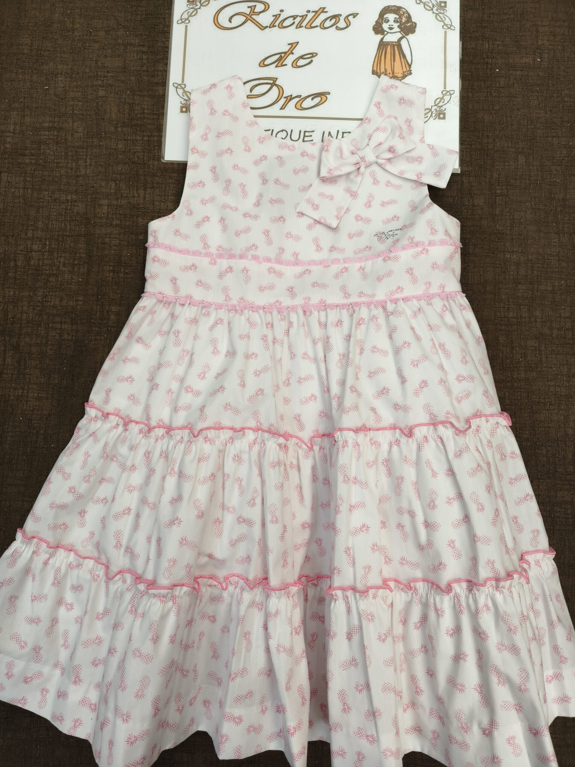 VESTIDO SAUCE de NOMA FERNANDEZ, vuelo, fondo blanco con dibujos de piñas en color rosa, verano 2026.